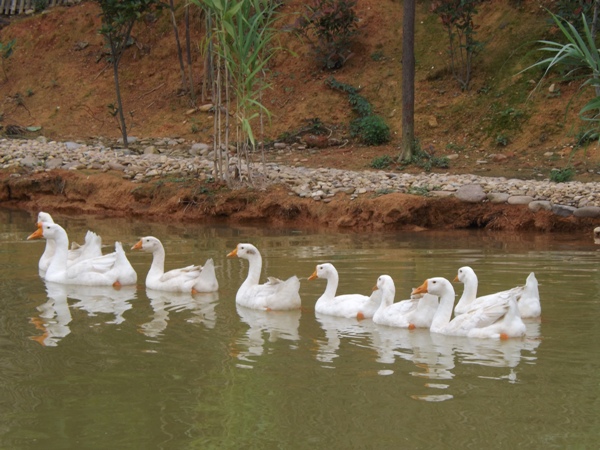 在董事長的親自帶領下,通過全體員工們的共同努力,曾是黃土雜草之地,如今已結出了豐碩的果實:在綠油油的西瓜地里,已經收獲了數不清的西瓜,員工們已經品嘗到了她的香甜,喜上眉梢;生態園的雞、鴨、鵝產下了不知有多少蛋,豐富了員工們的飲食生活,戲水中的鴨鵝個個彪肥體壯,煞是好看;花生地里長滿了一串串的花生;碩大的辣椒正源源不斷地端上員工們的餐桌;成群的魚兒在水中追逐。金色的秋天,到處是豐收的景象!收獲的是喜悅的心情!