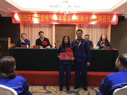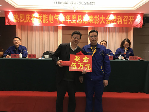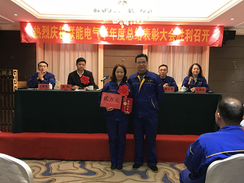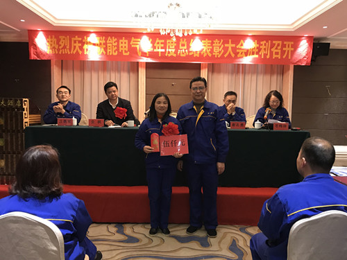 2017年11月18日,浙江聯能電氣有限公司在衢州市白天鵝大酒店隆重召開了2017年半年度員工總結表彰大會,大會由公司財務總監毛梅林主持。公司董事長李杰宣讀了2017年23—29號文件,包括表彰優秀團隊和優秀員工及全體員工上調工資等通知,給予出色完成銷售業績的公司副總經理金楓同志五萬元重獎!還對為公司作出突出貢獻的商務部袁利同志授予“勞動模范”稱號并授予兩萬元重獎!