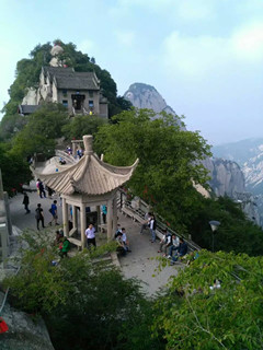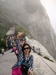 5月28日,登華山。天氣特別的晴朗,華山憑藉大自然風云變換的裝扮,十分壯觀。纜車把我們送上了北峰,站在北峰極目遠眺,山由大塊整石組成,有的似刀斧劈成,山峰高峻,溝壑深險。登西峰,其以陡峭聞名于天下,上山的路又窄又陡,兩旁是懸崖峭壁,成90度的石梯與石梯邊的鐵鏈緊緊相連,令人看著膽戰心驚,我也情不自禁的更加抓緊了鐵鏈。蒼龍嶺是上山途中最險的地方,攀爬時須分外小心。堅持就是勝利,登上山頂你才領略到“無限風光在險峰”。西峰的風景綺麗無比,在薄紗似的云霧中,讓你明白 “會當臨絕頂,一覽眾山小” 的真正含義。朦朧似幻,陽光絲絲縷縷透出,淡金色籠罩了山顛,分外壯觀。