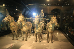 來到秦始皇兵馬俑博物館,先參觀豪華的銅車馬,講解員介紹每匹馬上按裝的各種功能以及要達到的作用,看過之后只能感嘆秦時的能工巧匠是多么智慧。參觀一號坑,真人大小的陶俑列成整齊的方陣,氣勢磅礴,一排排兵俑整齊地排列,仿佛隨時準備著戰斗。講解員告訴我們由于現在考古和文物保護技術還不成熟,有待進一步開發與挖掘。講解員告訴我們:在發掘中發現一把青銅劍,出土時壓在一個將軍俑下面,已經彎曲了,將俑一移開,劍立即直了,而且沒有一點銹跡,放在二十幾層紙上面能自行將紙劃破,經過幾千年的侵蝕真是奇跡。原來該劍上鍍了一層極薄的氧化鉻,聰明的古人掌握了這么先進的防銹技術。勤勞、樸實、智慧的祖先用他們的智慧創造著一個又一個奇跡,在煙波浩翰的歷史長河中實現著他們大氣磅礴的夢想。將中國的古典文明一步一步地推向世界文明的極致,反映了一個東方泱泱大國金光四射的磅礴與輝煌。