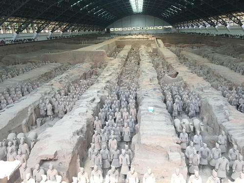 第四天,秦始皇兵馬俑博物館。這是一座建立在兵馬俑坑原址上的遺址性博物館,被譽為“世界第八大奇跡”。講解員給我們講解兵馬俑發現過程,后經考古工作者的精心勘探和挖掘出規模宏偉的大型兵馬俑坑(即一號俑坑)。關于兵馬俑的不解之謎有很多,其一兵馬俑彩繪物質只在超導世界存在,目前世界還未發現如此高科技合成物怎會出現在兩千年的秦朝;其二出土的青銅器埋在地下兩千多年光亮如新,發現采用了電子鍍鉻技術,而這項技術到20世紀才出現,當年如何處理無法解釋。最后最充滿神秘的無疑是驪山腳下的始皇陵,據記載陵園工程之浩大,用工人數之多,用時之長前所未有,至今仍沒有對其一探究竟,希望在有生之年可以目睹始皇陵的威武。