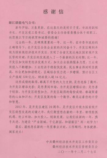 2012年1月4日,新年上班第一天,市經濟技術開發區管委會副主任邵新安一行專程代表開發區管委會蒞臨公司向聯能公司全體員工表示了新年的慰問!同時對聯能公司在2011年所取得的卓越成績還專門帶來了《感謝信》!