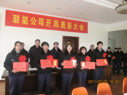 2011年 2月20日下午,浙江聯能電氣有限公司全體員工在公司禮堂召開了新年開局表彰大會。公司董事長李杰參加了會議,會議由董事長助理葛其運主持。在會上首先由各部門負責人針對出現的問題進行了表態性發言。同時還對在2010年工作成績突出“先進生產工作者、優秀新人和優秀員工”進行了表彰獎勵并佩戴了大紅花!先進代表還上臺發表了獲獎感言!